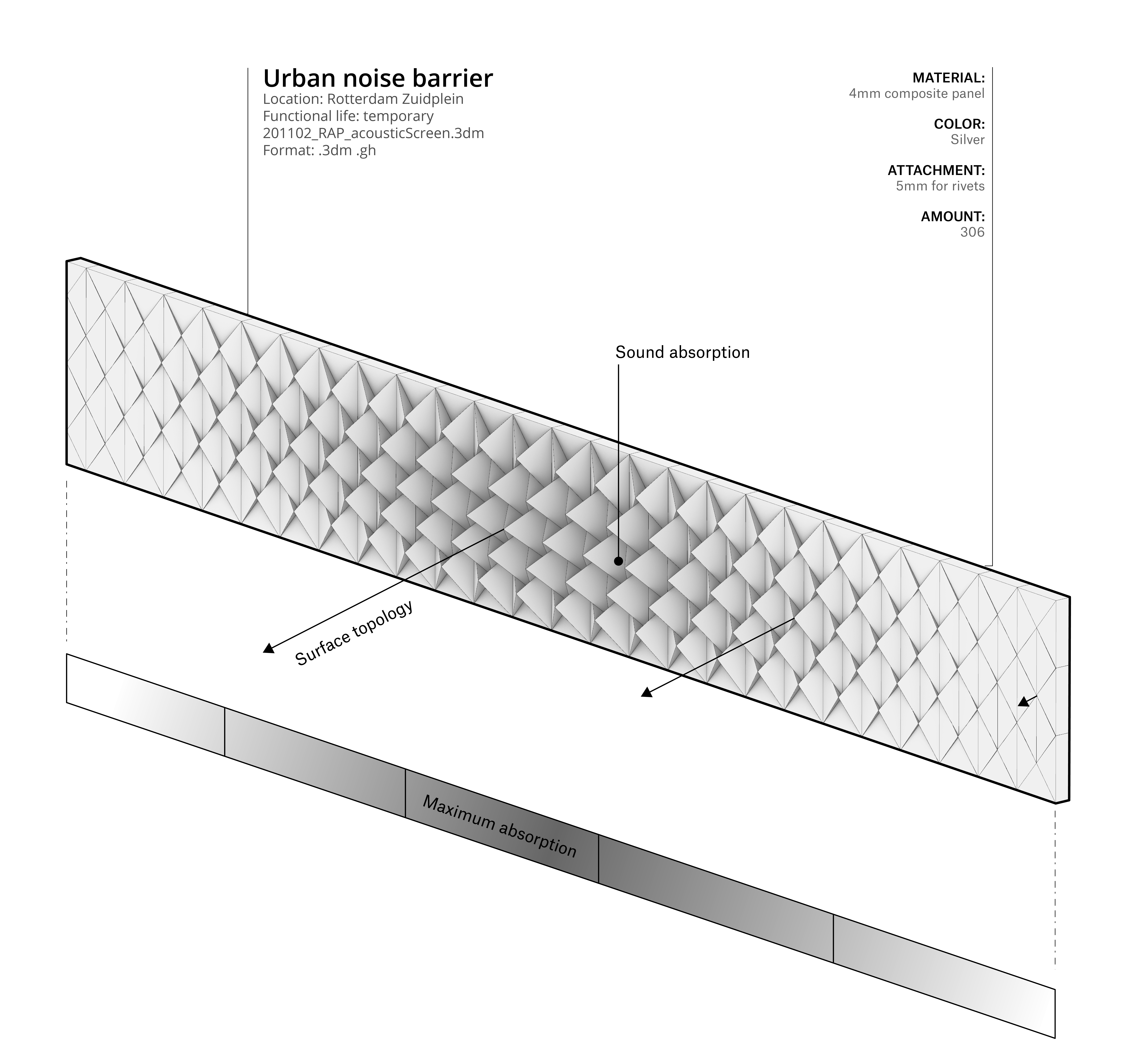 Because of the metamorphosis of the building’s surroundings like walkways, cycling paths and roads are rerouted and one of the new entrances to the area will be the gate underneath a residential high rise building. Studio RAP was asked to design a welcoming and recognisable entrance that at the same time lowers the noise for the apartments above the gate. Studio RAP came with a bespoke canopy design consisting of hundreds of unique triangles creating a fading pattern resonating the movements of the bypassing buses and cars.