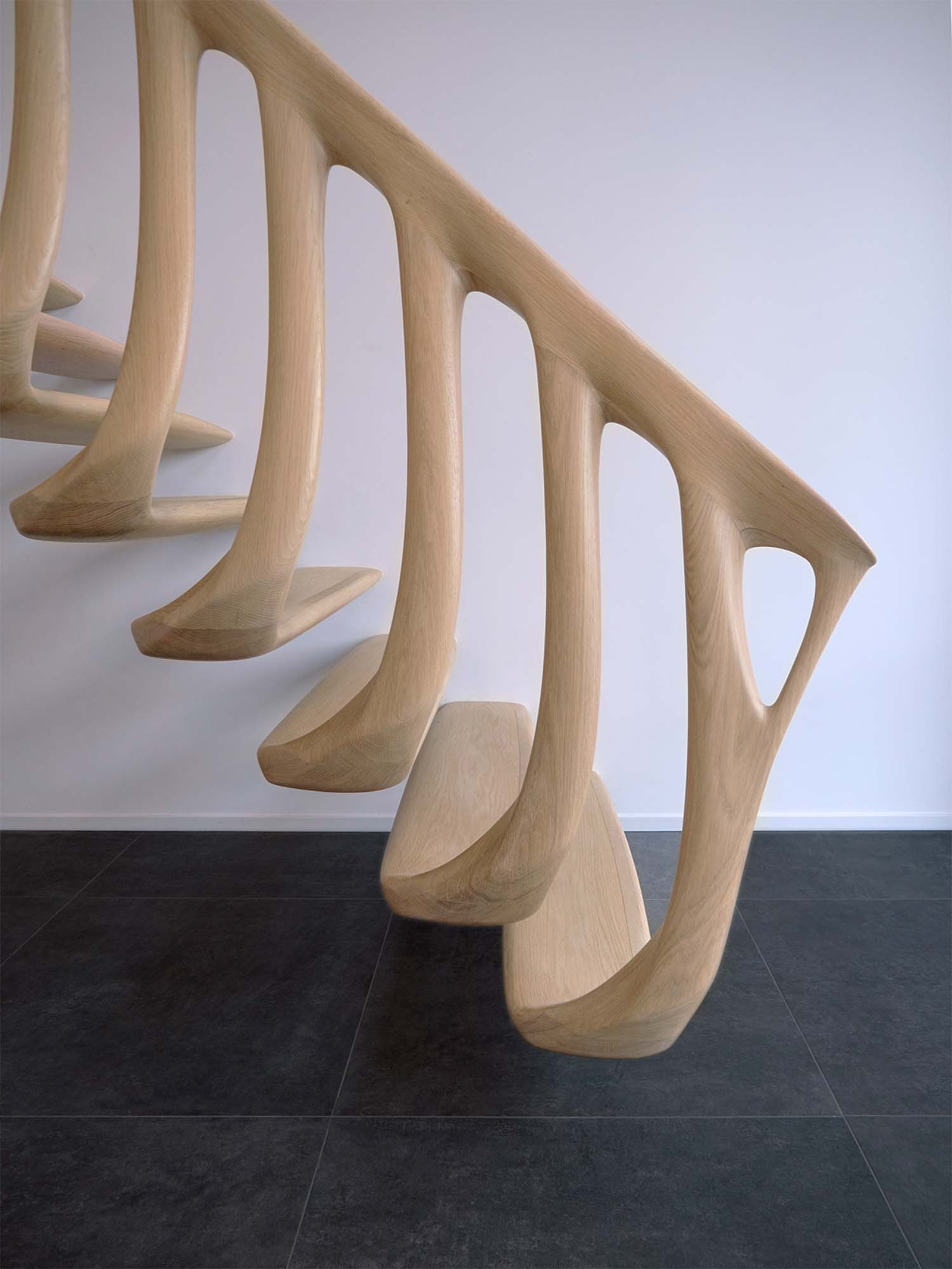 Studio RAP designed a free form staircase for Woodspecials, a company specialised in high-end woodcraft. It is a showcase of 5-axis milling and inspired by the art nouveau movement located at the entrance of their workshop. Together with the expertise of Woodspecials we were able to create an elegant staircase that shows the possibilities of digital fabrication.